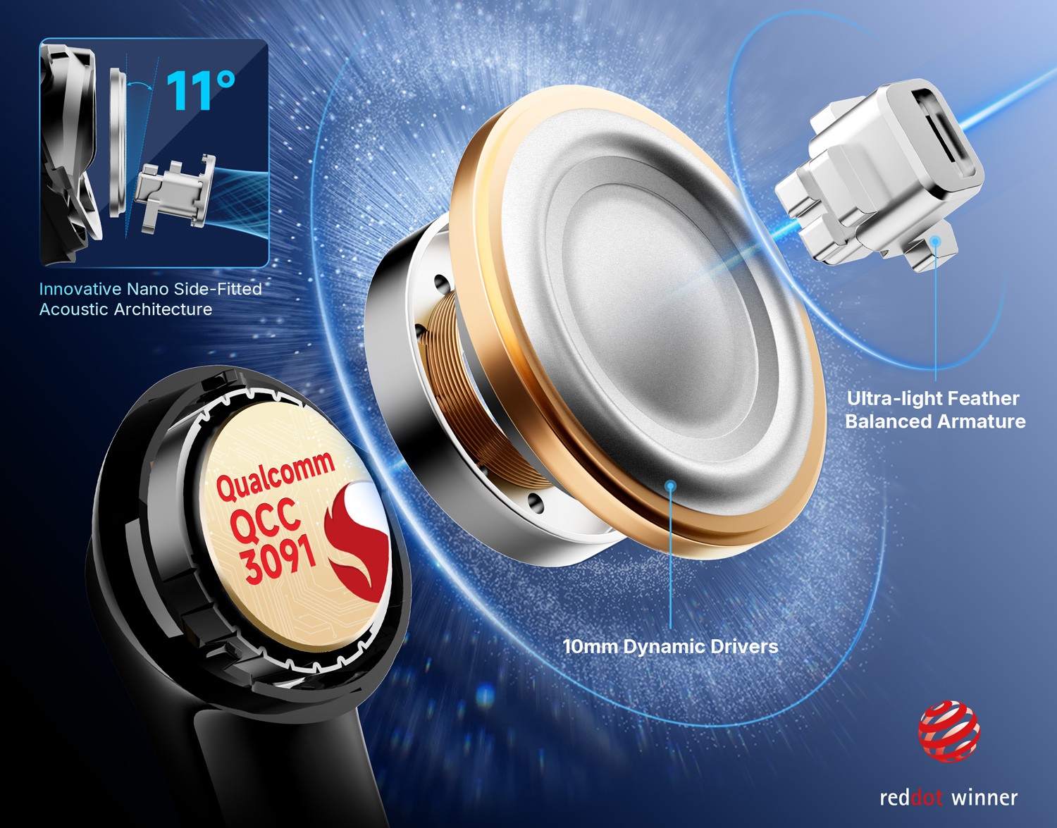 EarFun’s proprietary Nano Side-Fitted Acoustic Architecture positions the two drivers at a precise 11-degree angle to minimize magnetic interference and optimize sound resonance. According to EarFun’s CTO Rocky Deng, this specific angle reduces high-frequency attenuation, delivering clearer and more natural highs.