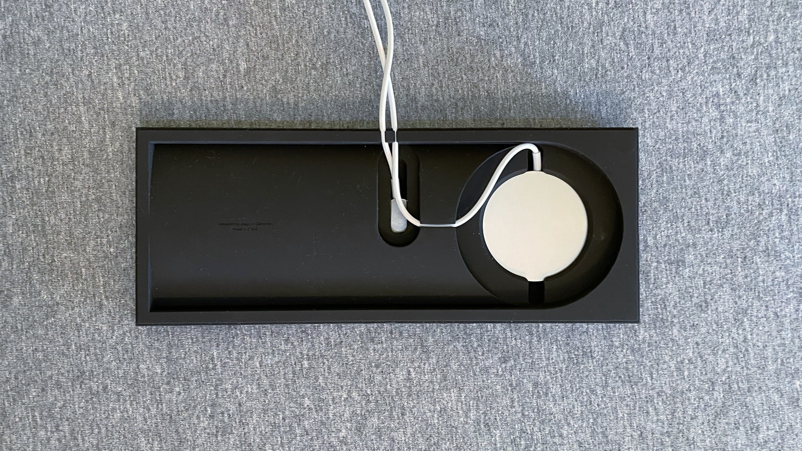 The iPhone charger is completely hidden within the Charging Tray Duo. But my tests with a MagSafe charger and an iPhone 12 show that this doesn’t interfere with 15 watts of wireless power transfer. All I need to do is put my handset in the right general area and the magnets in the iPhone and the charger take care of the rest.