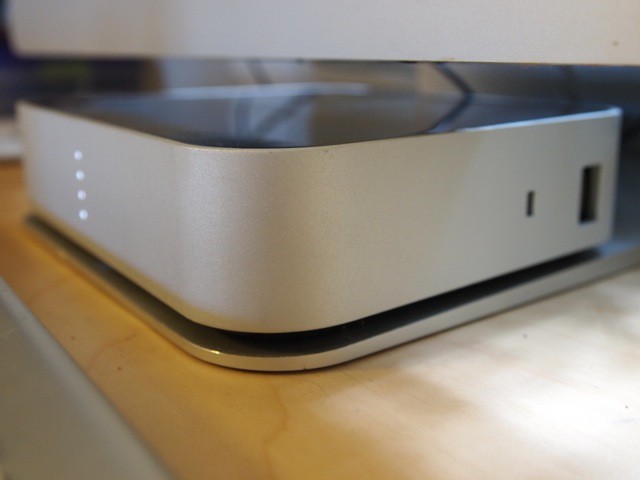 Outside, there’s a capacity gauge that shows how much storage is available. When all four white LEDs are shining, the drive is less than 20% full; one red LED says it’s more than 80% full.