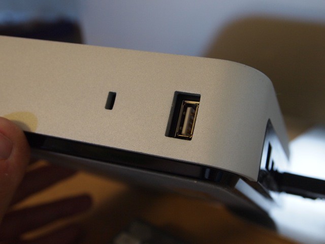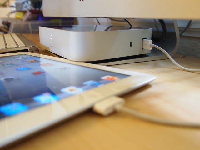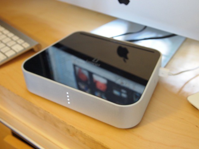 And then there’s the 2.1 amp USB charging port on the side of the drive. According to Iomega, it’s the quickest way to charge the big fat battery in an iPad (which charges painfully slowly with lower-power USB ports). The placement of the charging port is a big plus when using an iMac. I love this machine, I really do, but the USB ports on the back drive me crazy.