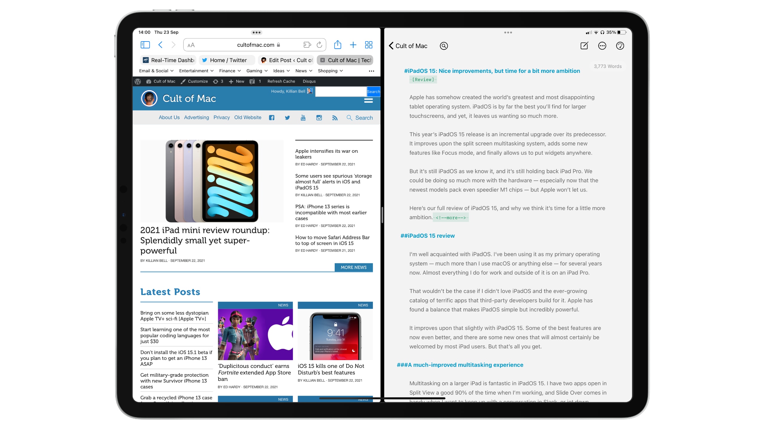 Multitasking on a larger iPad is fantastic in iPadOS 15. I have two apps open in Split View a good 90% of the time when I’m working. Slide Over comes in handy when I want to keep up with a conversation in Slack, or jot down something in the Notes app without disrupting my flow. And just like before, you can quickly drag and drop content between the apps you have open.