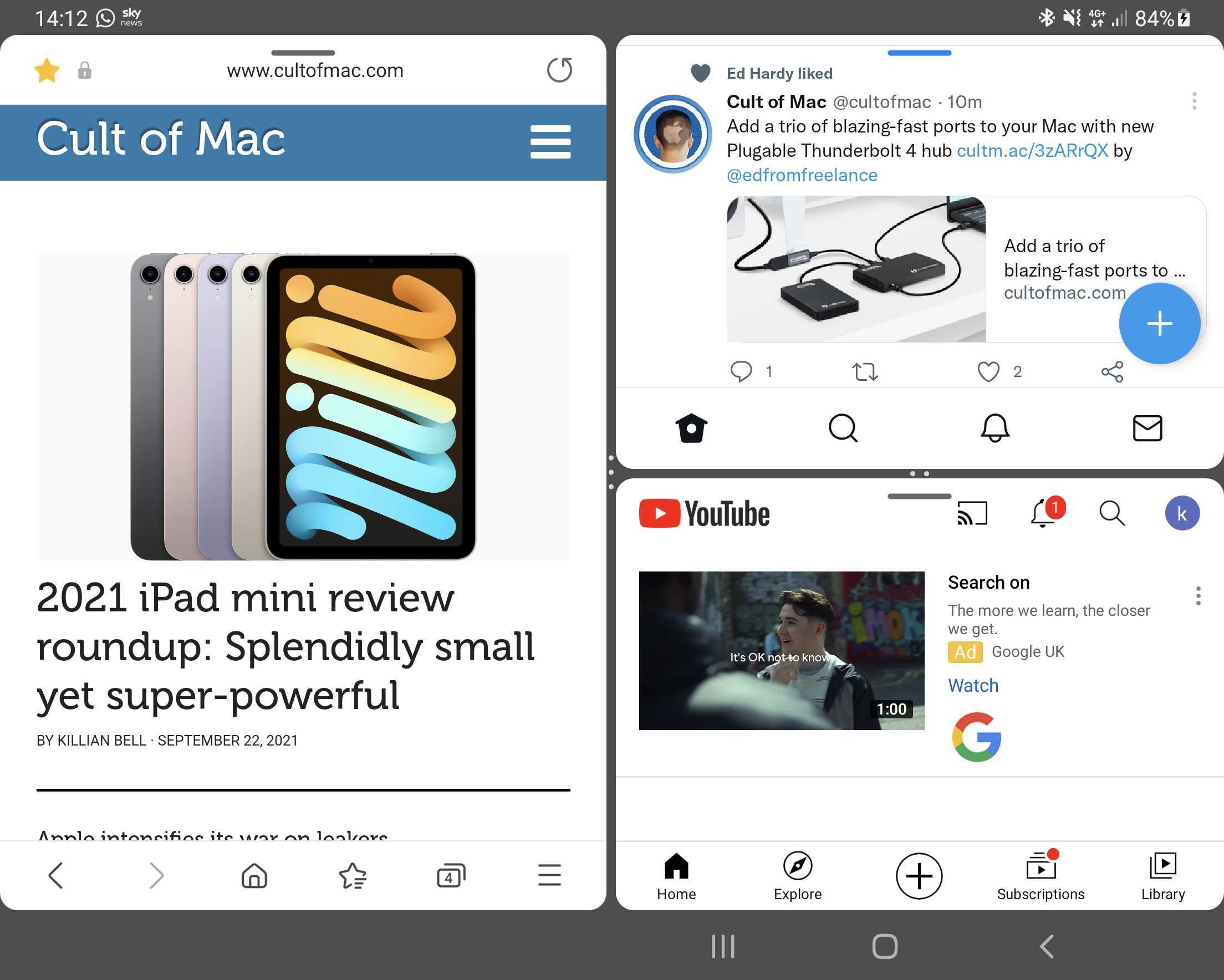 Another option could be to have one app take up half of the screen, while another two occupy the other side, one above the other — like the multitasking mode that’s so handy on Samsung’s Galaxy Fold. I think this would work great in some instances, like when you want to browse the web in Safari, take notes in Pages, and keep an eye on a video in YouTube.