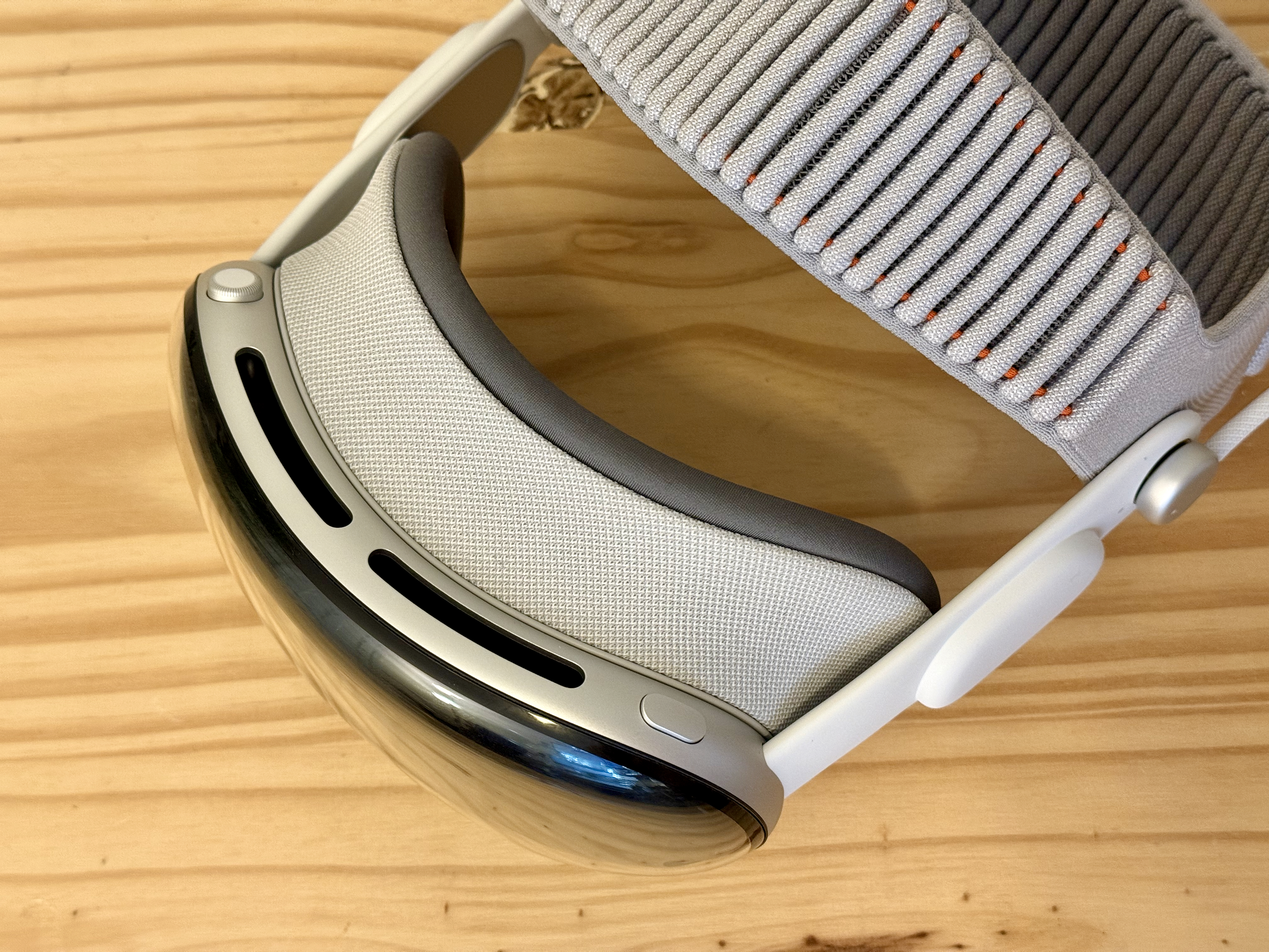 The Vision Pro’s body is iconic Apple silver aluminum, with vents on the top and bottom. The digital crown and top button are intuitively placed to find without looking. The inside is dark felt. The Light Seal snaps on magnetically and blocks your peripheral vision. The bridges are a soft-touch rubber, and contain the surprisingly excellent speakers.