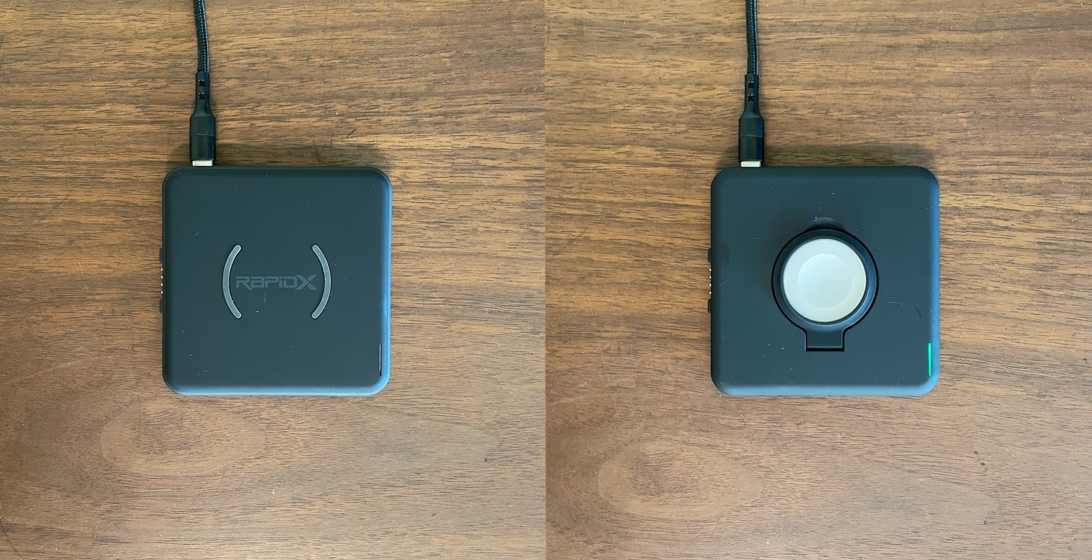 RapidX designed the accessory before MagSafe was announced, so the charger doesn’t include magnets to automatically align the handset. But it’s not really necessary — placing my iPhone on the unit always makes a wireless connection as long as it’s generally centered. And a MagSafe-compatible unit is in development.