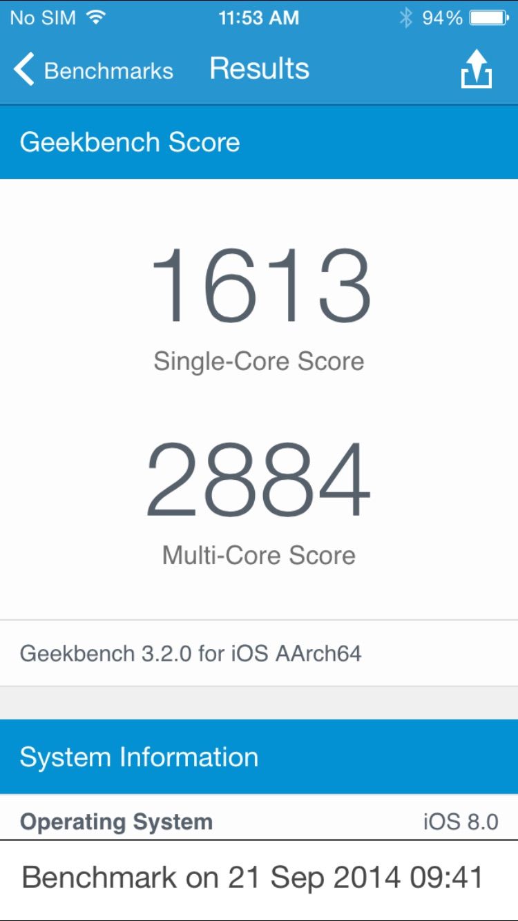 In the Geekbench 3 benchmark test, the iPhone 6 I tested rated 1,613 on the single-core score and 2,884 in the multi-score score. That’s a step up from last year’s 5s (1,394 and 2,511 respectively) and surprisingly, even better than the scores my colleague Killian got with the 6 Plus (which scored a slightly lower 1,592 and 2,846).
