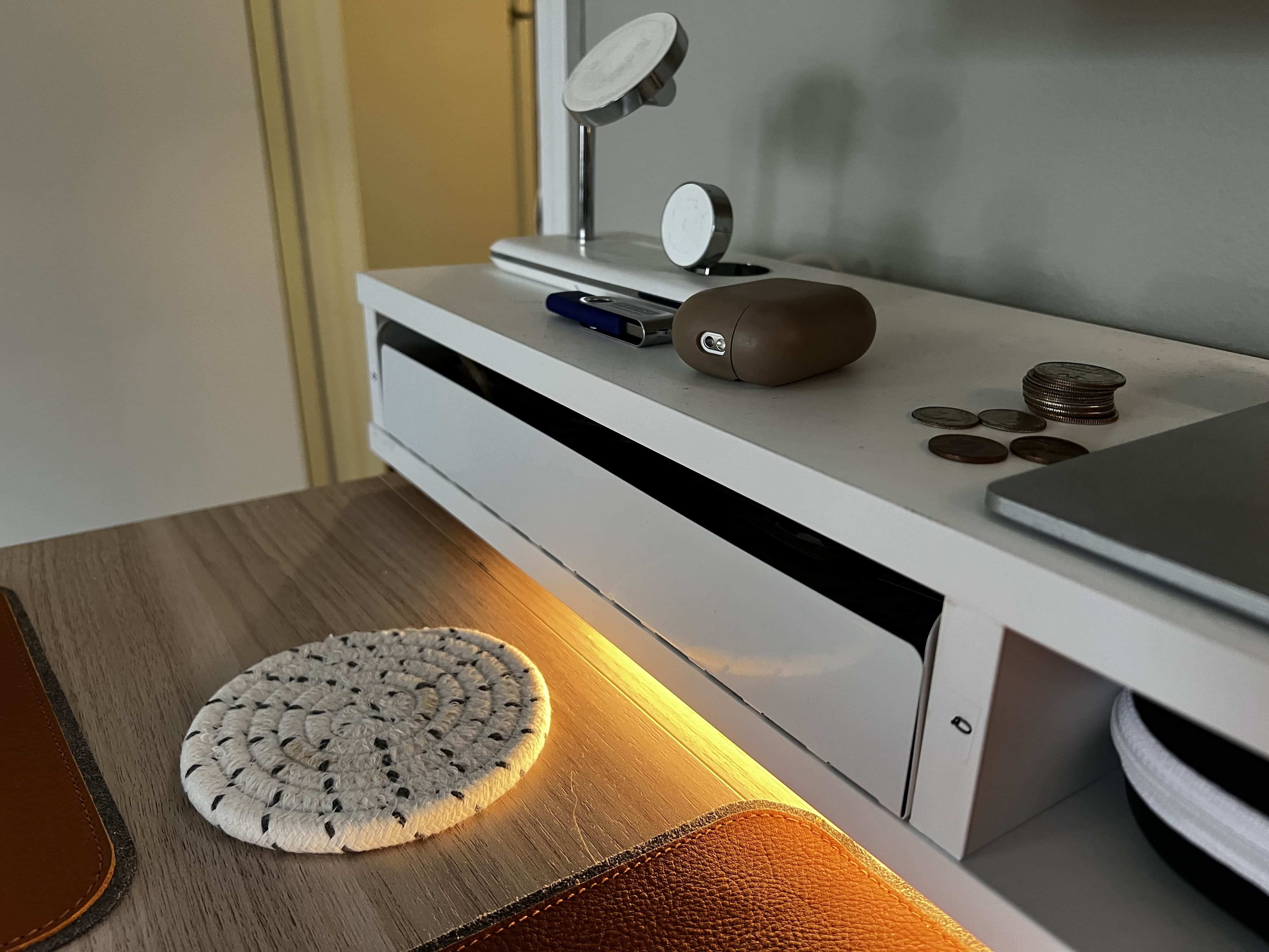 I have two 27-inch 4K displays on standard stands, a 14-inch M1 MacBook Pro laying flat and various other items like a 3-in-1 charging stand, several sets of earbuds and a flashlight on top of the desk shelf. Under that are two drawers on either end and an open shelf in the middle, with room for low-profile items of all sorts.