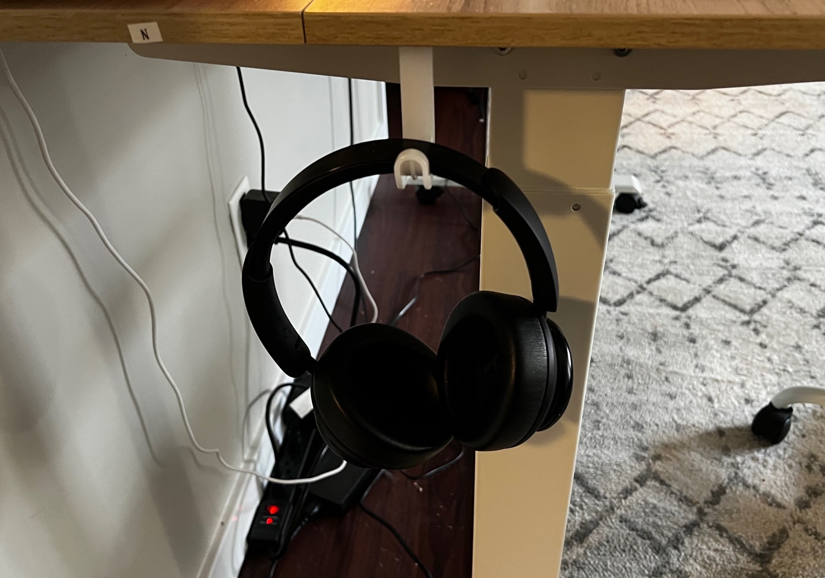 Plastic hooks come down from the underside of the wooden desktop on both ends, providing good spots to hang headphones and perhaps cables. But there are no baskets, channels or other built-in ways to wrangle cables.