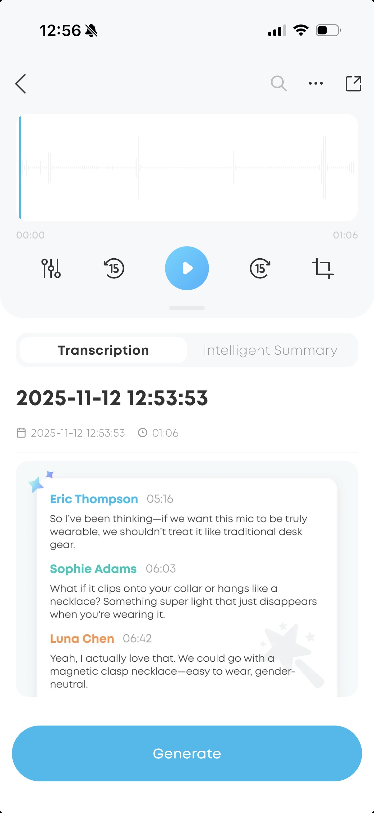 One thoughtful feature is the haptic feedback system. When you double-tap the device to mark important moments during recording, a subtle buzz confirms your action without interrupting the meeting or requiring you to look at the device. These marked moments, or time stamps, appear highlighted in your transcript, allowing you to jump directly to key discussion points during review.