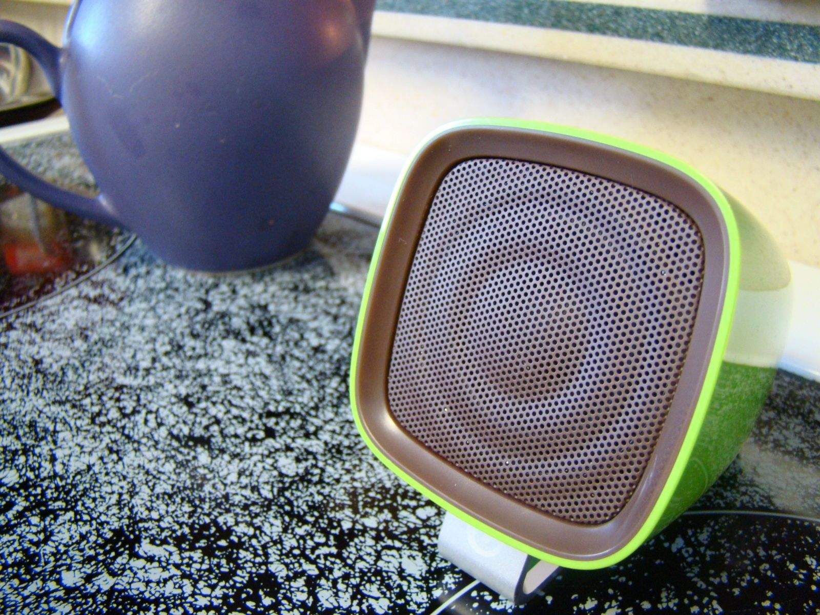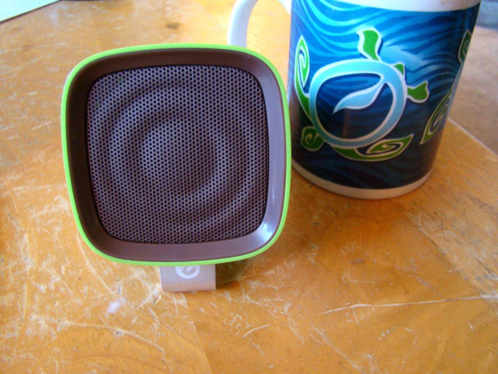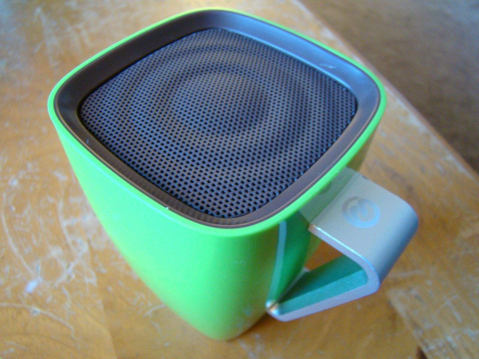 Around the house, though, this is a winner. The Music Cup is delightful to look at, sits up like a mug, or on its handle like a megaphone, and just keeps out of the way no matter where I put it. On the kitchen counter while cooking, on the coffee table while working, or on a shelf while folding laundry, the Music Cup is small enough to put anywhere, cute enough to look at, and loud enough to be heard over any kitchen noise.