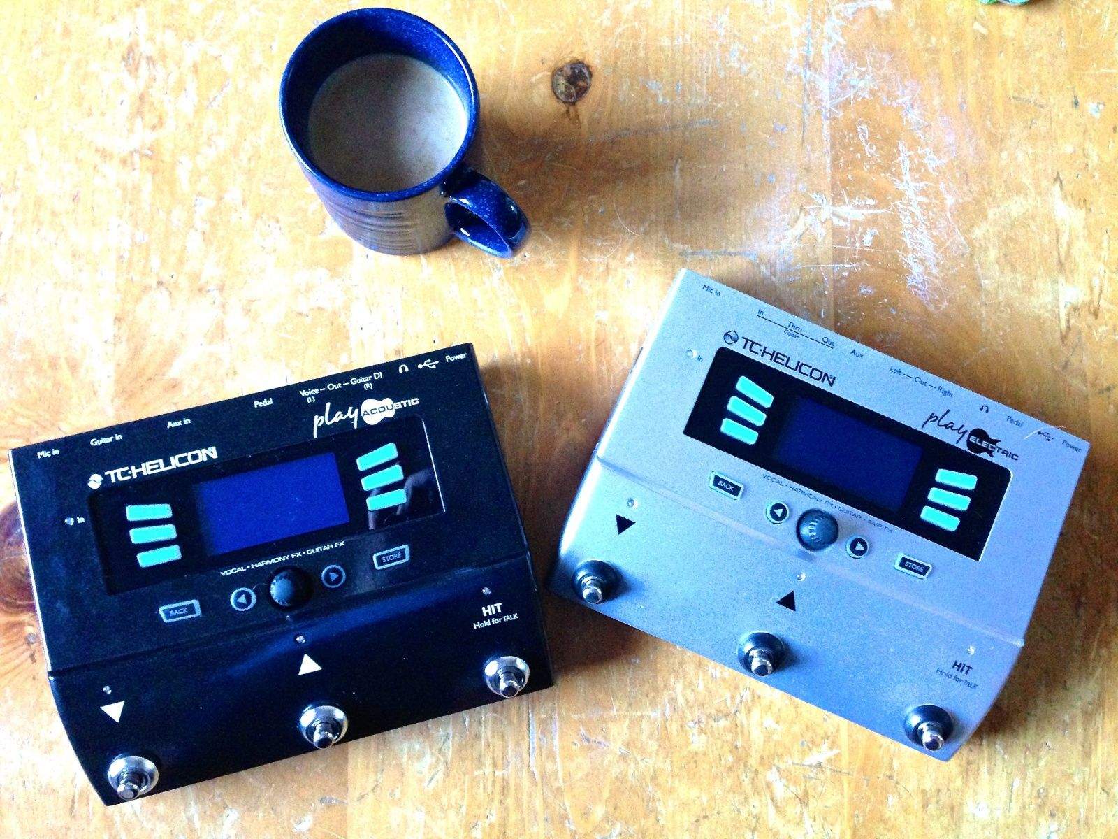 The difference between the Play Electric and Acoustic is mainly in the type of guitar effects you’ll run into. The acoustic model lets you choose between different reverb, chorus, and resonance settings, with a guitar feedback protection circuit to keep from stunning your audiences with a squeal of feedback. The electric model has guitar out jacks on the back to let you send your vocals to the PA and your guitar sound to an amp (if you like), and allows you to control the type of amp modeling, reverb, compression and delay effects, and modulation effect (like Chorus or Flange). The one you’ll want to get will depend on your own play style — if you just need a guitar sweetener and vocal effects, the Play Acoustic is perfect. If you need distortion and the like, the Play Electric is the one to grab.
