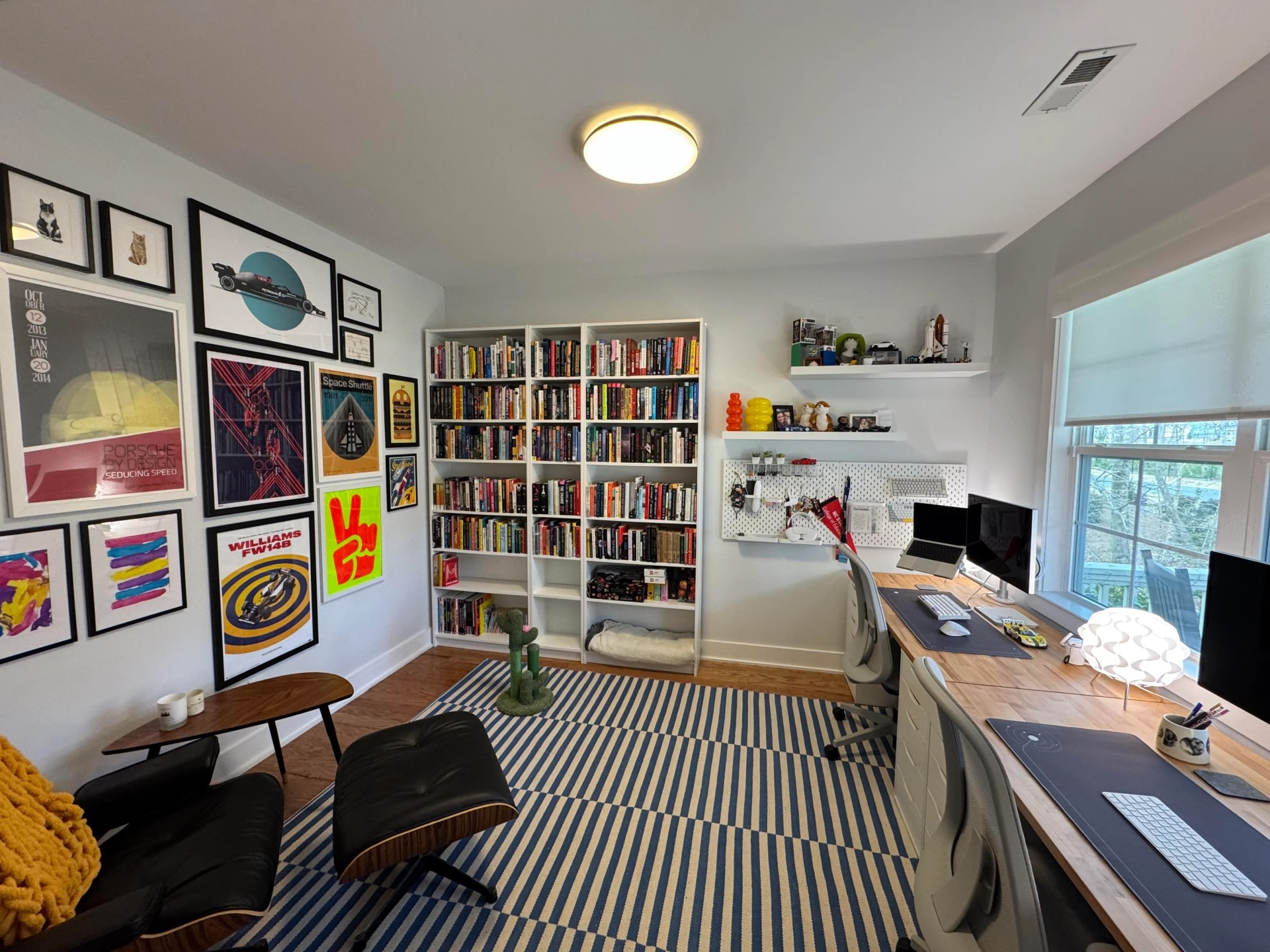 “We rearranged the room so I could see the outside world while home all day, upgraded our desk setups, and added more to our gallery wall,” he said. “I work here 4 days a week and my wife uses her side of the desk for remote tutoring and any other work she needs to get done in the evenings/on the weekends.”