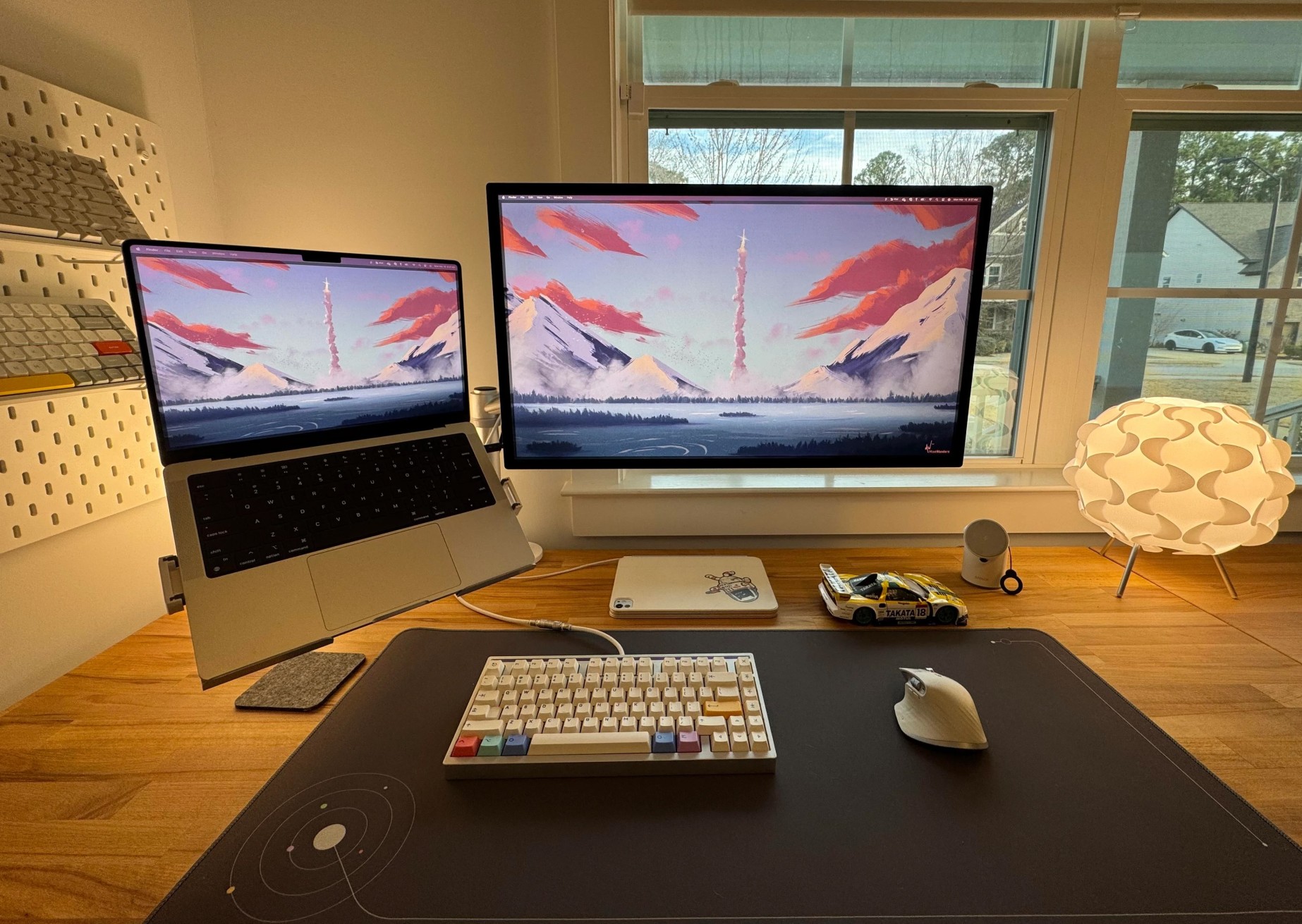 Redditor Ouhei showcased the happy matrimonial double-MacBook Pro setup in a post called “Dual home office setup.” It’s not the first husband-and-wife dual workstation I’ve seen, but they seem rare. He said increased WFH led to the new office arrangement, with his-and-hers MacBook Pro setups sitting side by side next to office windows. His is an M3 Pro and hers is an M1 Pro. Both drive Studio Displays. And both laptops and both displays sit on Viozen Monitor and Laptop Mounts — an unfamiliar brand that looks affordable and efficient. Left-handed Ouhei sits on the left.