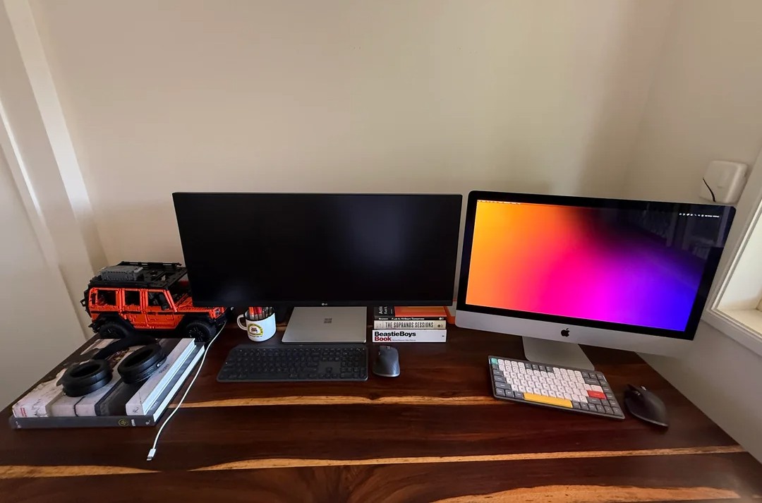 “I always envisioned a dual Studio Display setup,” Bronc replied. “That LG DualUp was purchased after I realized my existing ultra wide LG wouldn’t have fit on the desk lol.”