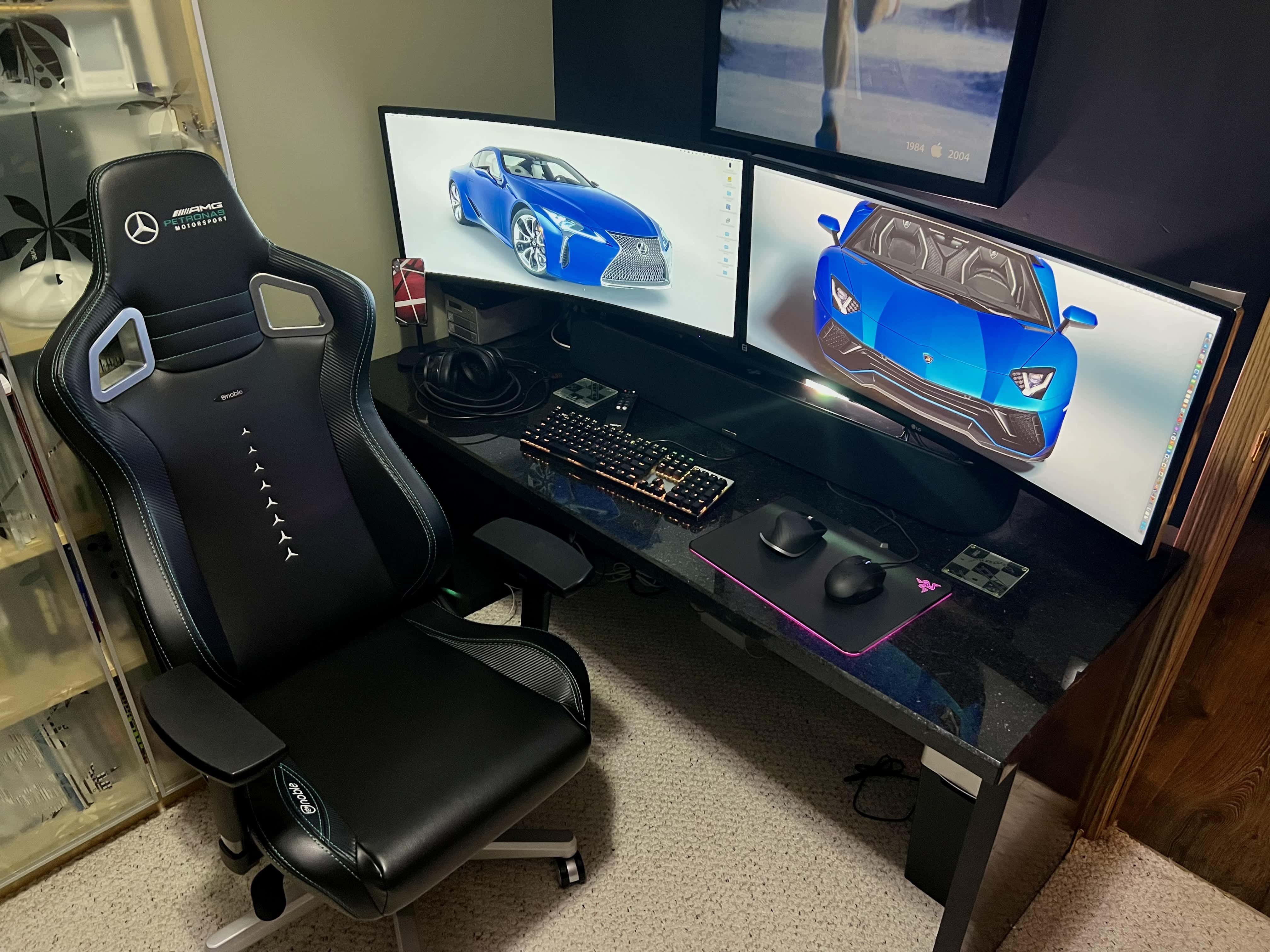 What sets this setup apart isn’t just the rare sighting of a late-2013 trash-can Mac Pro in active use. It’s the spectacular visual context surrounding it. The workstation features two perfectly leveled, curved gaming monitors and a suite of capable gaming peripherals. But the real showstoppers are the vintage Apple promotional artworks adorning the walls. A revised version of the landmark Ridley Scott-directed “1984” Super Bowl ad poster — with an iPod photoshopped into the original image — looms large above the monitors. An early iPod touch promotional poster overlooks the scene from the upper left. It’s a setup that doubles as an Apple history museum.