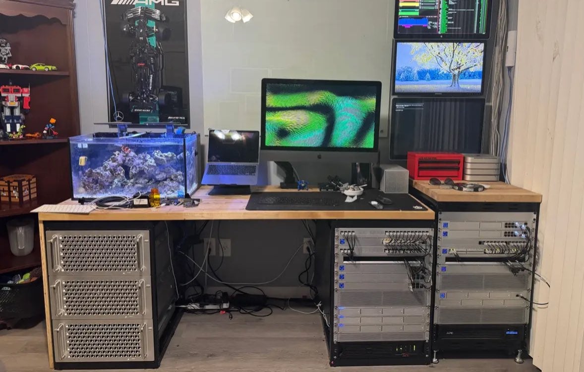 When three Mac Pro towers aren’t enough, add racks of high-capacity Ubiquiti Network Video Recorders, heavy-duty routers and a cascading array of Gigabit switches. That’s precisely what this anonymous but clearly formidable power user assembled. The centerpiece is a trio of 2019 Mac Pro machines, one of which sports an Intel Xeon Gold 6212U processor, 96GB of RAM, a 256GB Apple SSD and a 1TB NVMe PCIe adapter card. The other two feature 16-core Xeon CPUs, 64GB RAM and 2TB SSDs. Stacked alongside three Ubiquiti UNVRs with 4TB drives running continuous NFS for Proxmox, two UDM SE failover routers and multiple Gigabit switches, this workstation is beyond bragging rights territory — it’s an infrastructure.