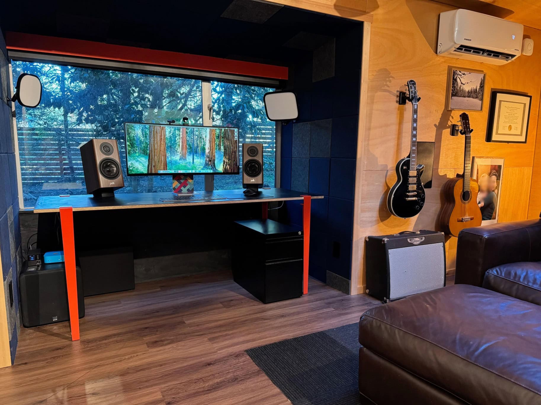 In this setup from the Pacific Northwest, Polk Audio boosts Mac mini sound with bookshelf speakers on the desk as well as a subwoofer under it. But that’s not the extent of the user’s devotion to Polk, an admired longtime brand we rarely, if ever, see in setups coverage. The Mac mini setup is just one part of a magnificent man shed. The other part is a home theater festooned with more than enough Polk Audio hardware for stellar surround sound.