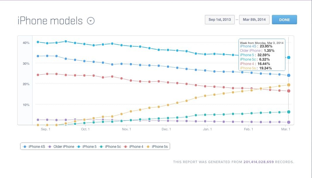 If you love the iPhone 5c, here’s a painful chart, courtesy of analytics platform Mixpanel: Growth of the iPhone 5c is pretty much stagnant at just around 6% (roughly where it’s been since Christmas), even as the iPhone 5s has achieved a 20% share of the iPhone market, overtaking the iPhone 4 and approaching the iPhone 4s in popularity.