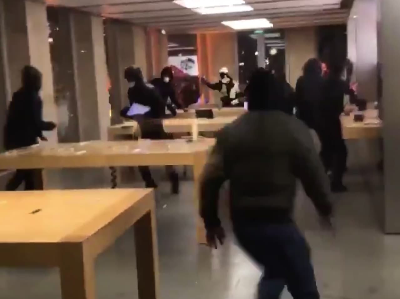 In a clip widely shared on Twitter, looters entered the Apple Sainte-Catherine store on Saturday night. They proceeded to pull MacBooks, iPhones and other items off the shelves and tables. Some of those involved with the incident were wearing the yellow vests associated with the riots.