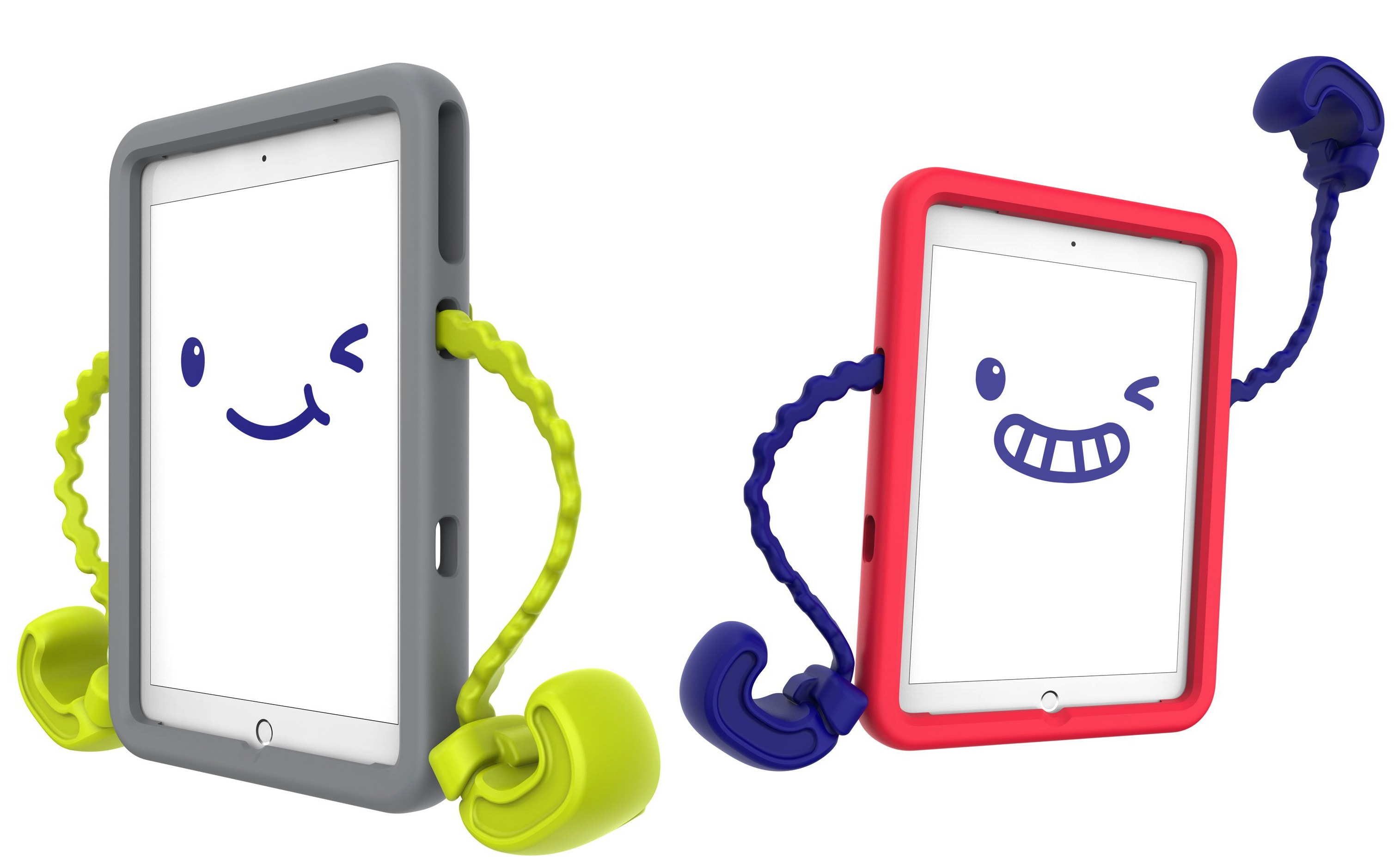 Made of sturdy, but soft material and boasting bright colors, the big innovation of the Case-E cases is the pair of (detachable) flexible arms sported by each case. These can be used for either standing your iPad up, using the oversized hands for balance, or wrapping them around car seats for safe viewing on the go.
